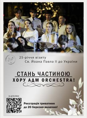 З нагоди 25-ї річниці візиту св. Йоана Павла ІІ до України ХОР ADM ORCHESTRA запрошує активну і талановиту молодь віком від 15 років стати частиною музичної спільноти Львівської архідієцезії. Це простір для творчого зростання, об’єднаний спільною метою — прославляти Господа через музику.