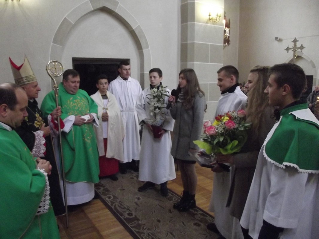 W sobotę, przed uroczystą Mszą świętą inaugurującą wizytację przedstawiciele parafii, państwo Tadeusz i Luba Dobrowolscy, jubilaci z 60-cio letnim stażem małżeńskim, przywitali Arcybiskupa chlebem i solą. A państwo Jan i Elżbieta Gnus wraz z dziećmi wypowiedzieli słowa przywitania. Następnie ksiądz proboszcz Andrzej Draws przedstawił historię parafii i również przywitał Ojca Archidiecezji.