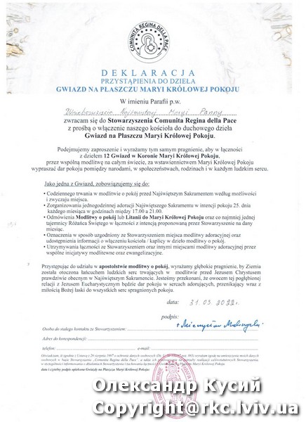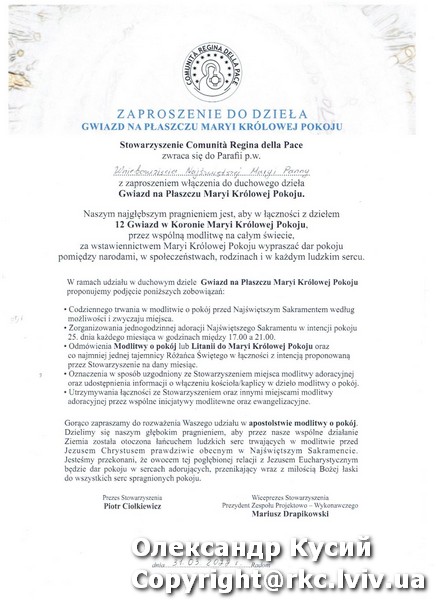 Pragnieniem Stowarzyszenia „Comunità Regina della Pace” jest, by orędowniczy płaszcz Matki Bożej rozpostarł się nad Ukrainą i całym światem. Zachęcamy do włączenia się do tego dzieła, któremu przewodzi Maryja Królowa Pokoju, gdyż jesteśmy przekonani, że modlitwa zanoszona do Chrystusa za Jej pośrednictwem jest najskuteczniejszym orężem w duchowej walce o pokój.