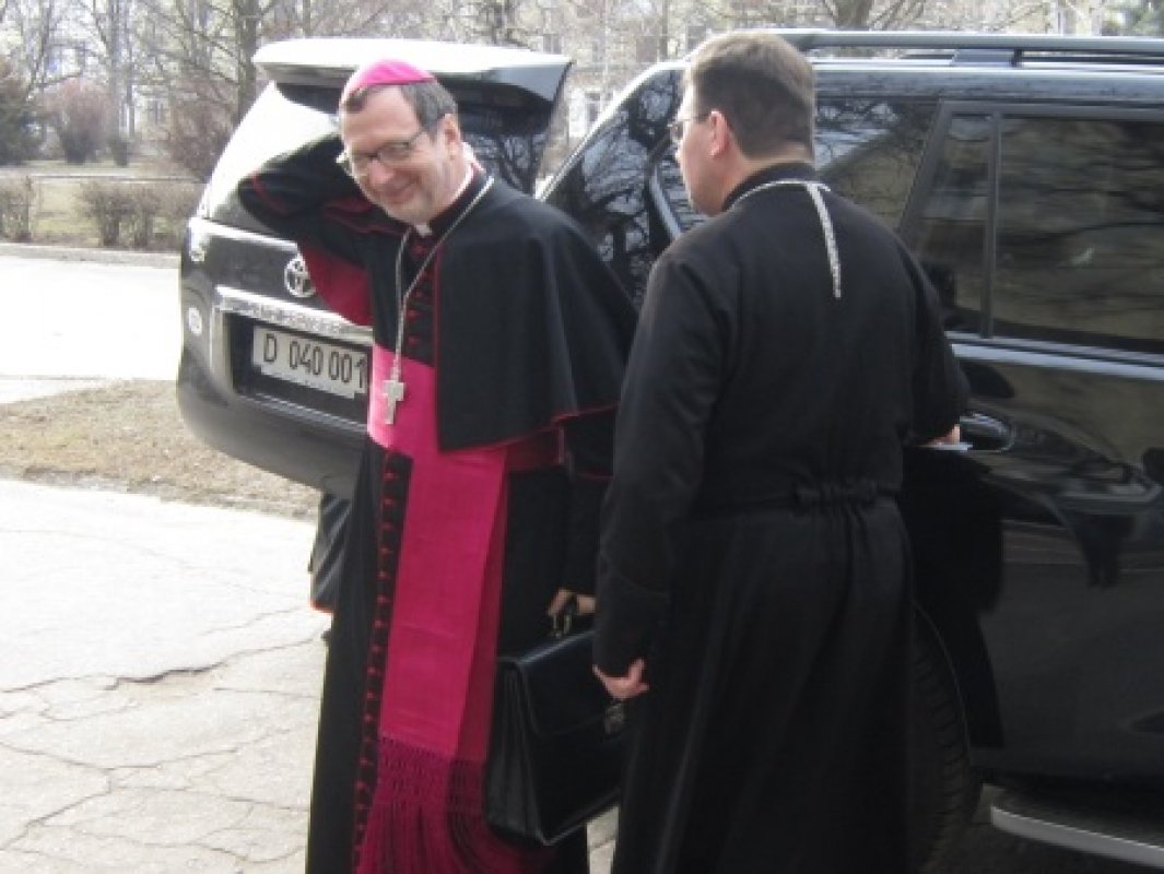 Сегодня 24 февраля, апостольский нунций Святого Престола встретился с мэром города, побывал в благотворительном фонде "Каритас Краматорск", а также намерен встретится с переселенцами проживающими в Краматорске.