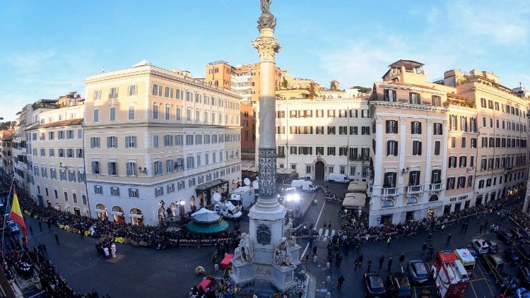 Ступаючи слідами своїх попередників, також і Папа Превост пополудні цього дня прибув на Іспанську площу Риму. Тут з ініціативи блаженного Папи Пія IX, який 8 грудня 1854 року проголосив догму про Непорочне Зачаття Пресвятої Діви Марії, через три роки після цього було встановлено статую Непорочнозачатої, яка височіє на 12-метровій колоні. Папа Пій XII почав надсилати квіти на площу Іспанії в урочистість Непорочного Зачаття, а святий Іван XXIII у 1958 році відвідав площу і поклав до підніжжя монумента кошик білих троянд. Цю традицію підтримали також святий Павло VI, святий Іван Павло II, Бенедикт XVI і Франциск. Прийшла черга і Папи Лева XIV.