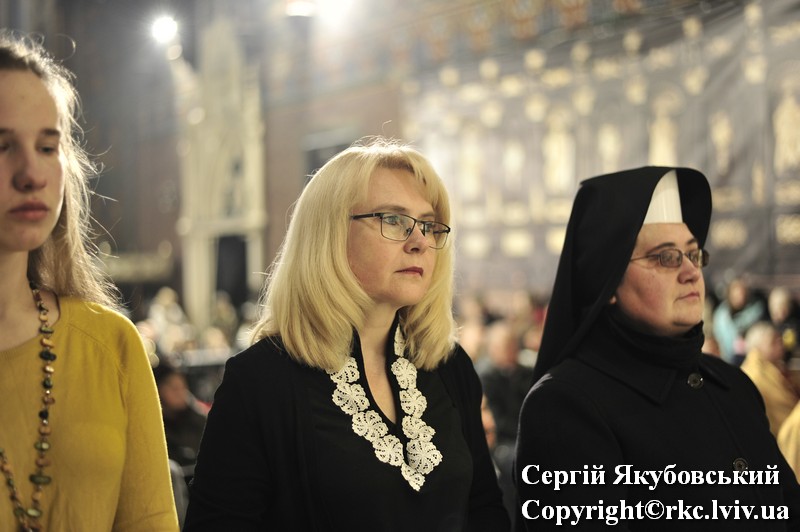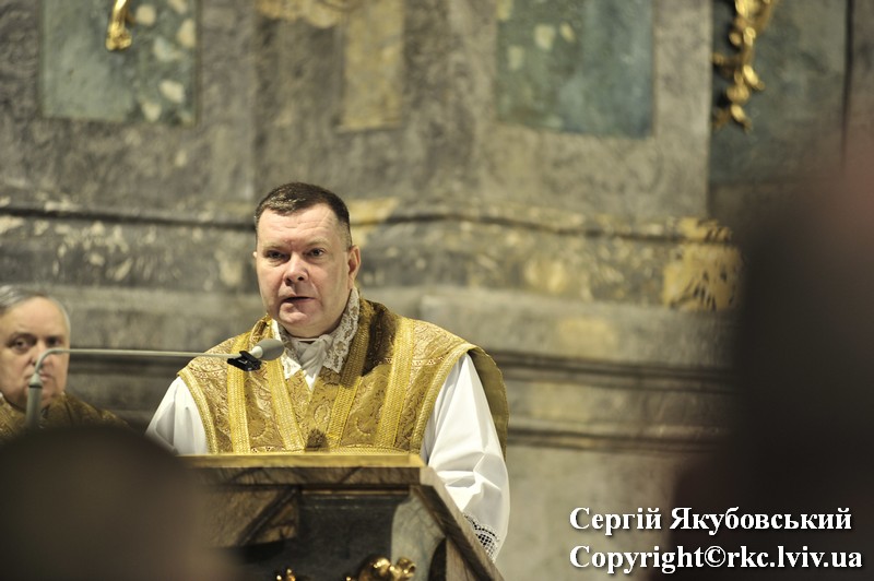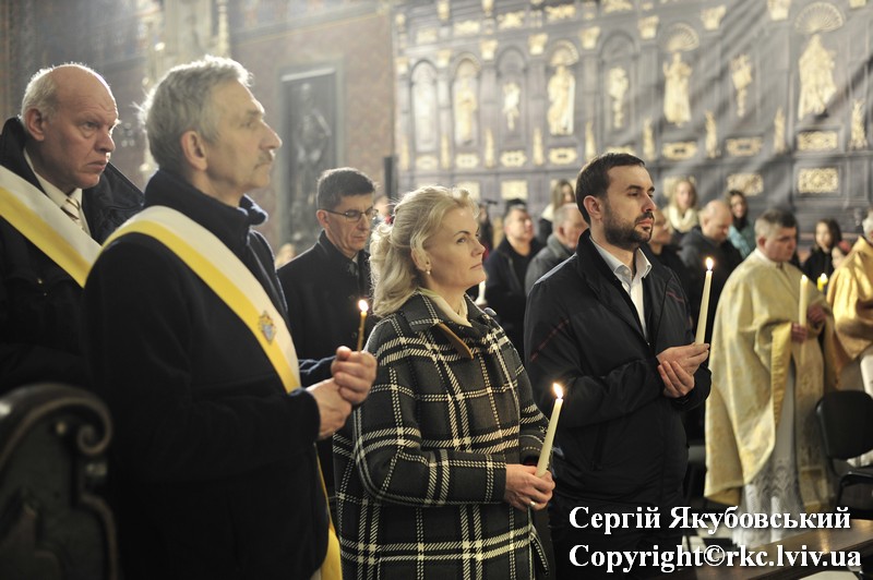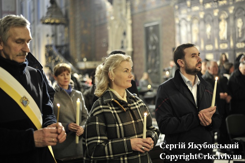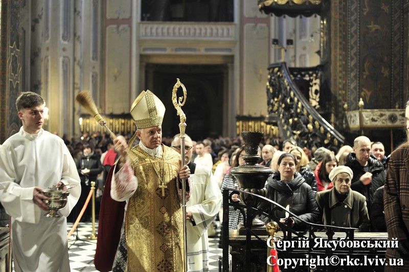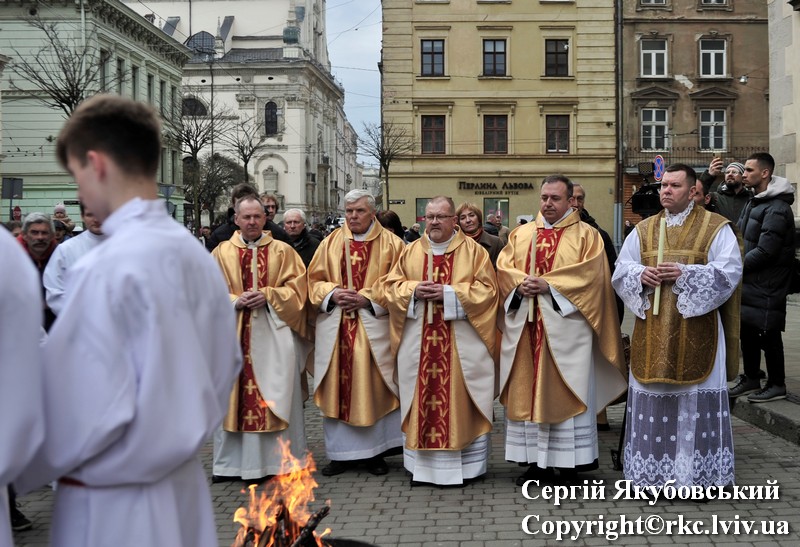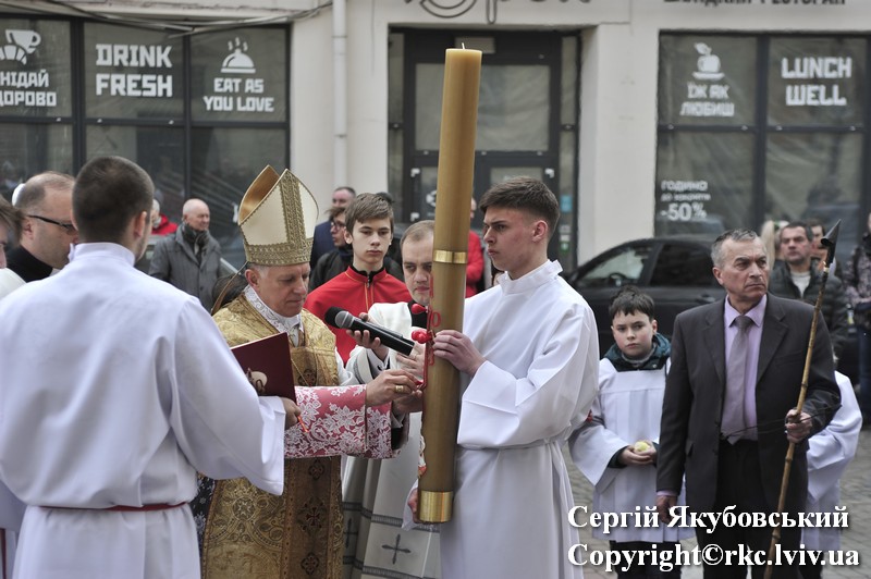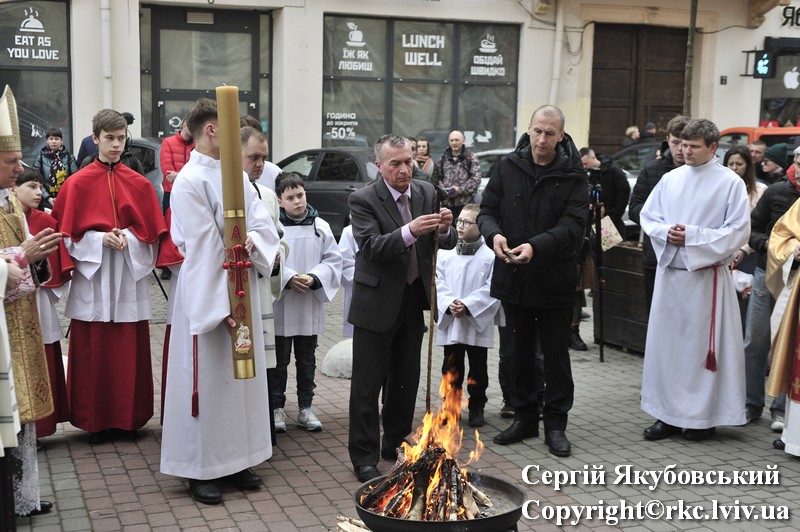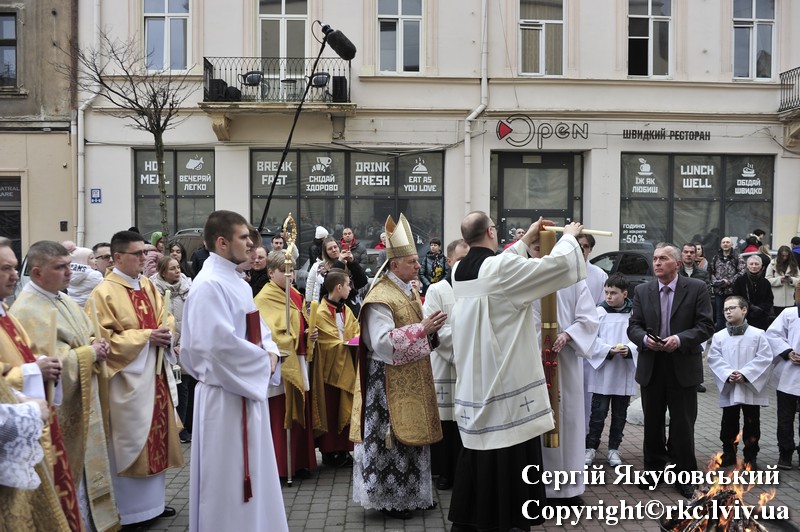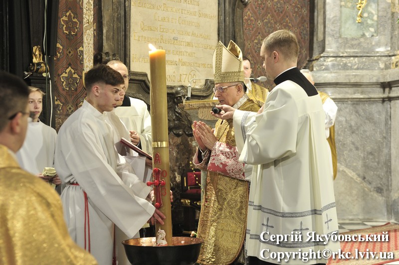 Podczas procesji do ołtarza duchowni dzielili się paschalnym ogniem. Liturgię światła zastąpiono czytaniami z psalmami. Arcybiskup Mieczysław Mokrzycki uroczyście poświęcił wodę, którą pokropił obecnych w katedrze. Następnie wygłosił kazanie.