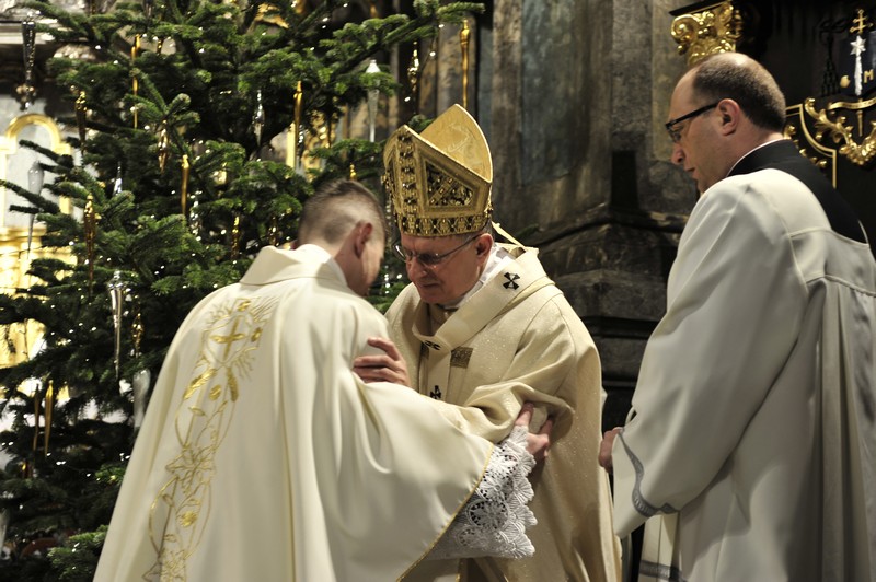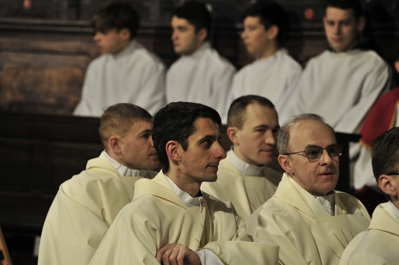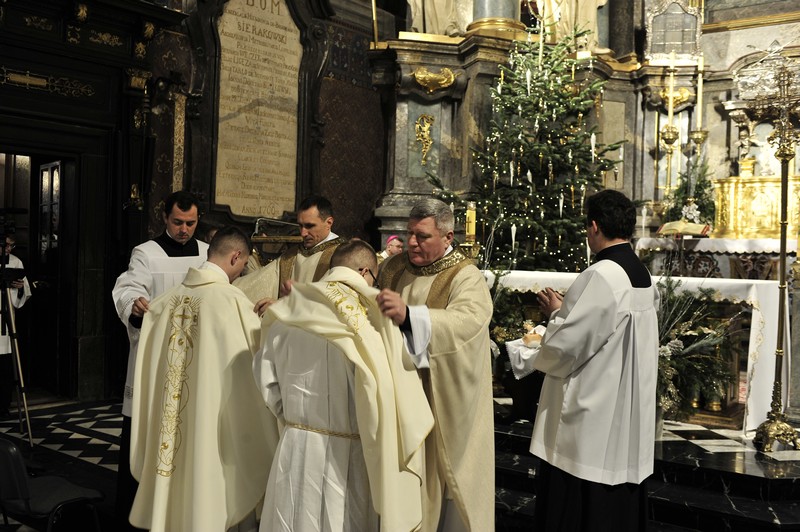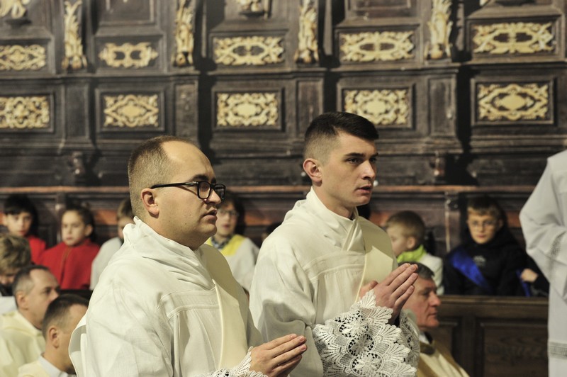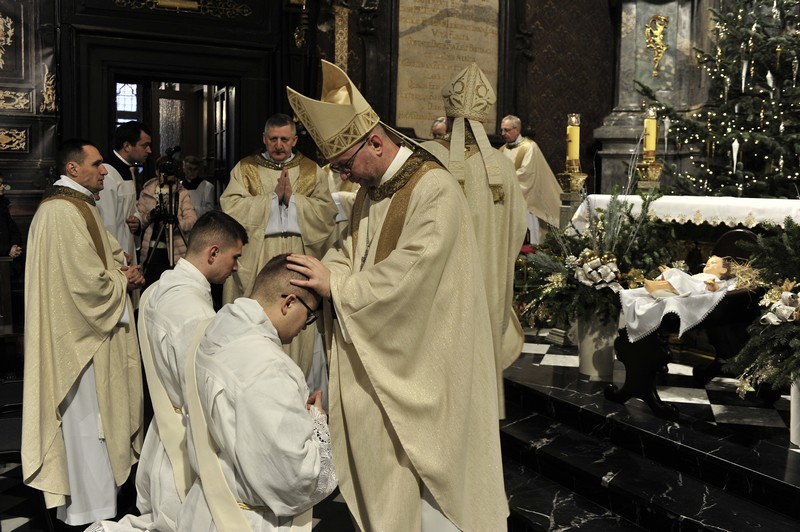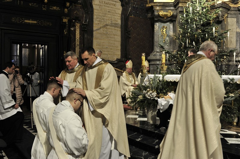Po Liturgii Słowa nastąpił obrzęd święceń kapłańskich. Diakoni modlili się leżąc krzyżem na posadce a wierni w tym czasie modlili się litanią do Wszystkich Świętych. Potem diakoni wkładając swoje dłonie w dłonie biskupa ordynariusza zaświadczyli posłuszeństwo Kościołowi i biskupom.