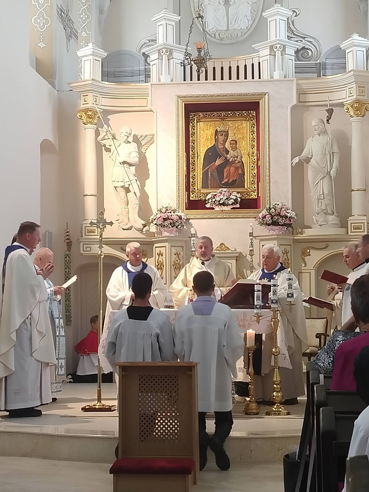 Homilia wygłoszona również przez ks.dziekana prowadziła nas do zgłębienia prawdy o Maryi rodzącej w naszych sercach Chrystusa , dawcę prawdziwego Pokoju. ..."Człowiek prawdziwie wierzący nigdy się nie boi, nie żyje w trwodze w strachu..." W Eucharystii dziękowaliśmy też za posługę w naszej diecezji ks.b-pa Edwarda Kawy obecnego ordynariusza diecezji kamieniecko-podolskiej, który często przybywał do naszego Sanktuarium. Wszystkim kapłanom modlącym się razem z nami, ojcom greckokatolickim z Janowa, wolontariuszom zbierającym na samochód dla wojskowych i oczywiście samym pielgrzymom , składam serdeczne Bóg zapłać.
