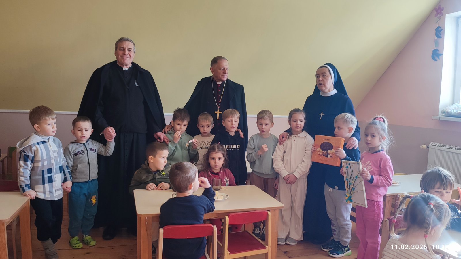 Najpierw nasz arcypasterz odprawił Eucharystię od jakiej raz w tygodniu zaczynają się zajęcia dla dzieci, następnie odwiedził przedszkole i spotkał się z siostrami Służebniczkami NMP w ich klasztorze czyli w mieszkaniu przy ul. Horynia.