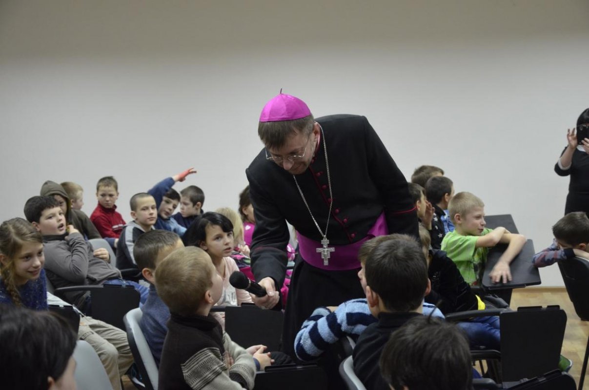 The bishop held an active and interesting conversation with children who were interested in various questions like: “Why is Your hat so small?”, “Where do You live?”, “What languages do You speak?”, “How many churches have You visited?”, etc.