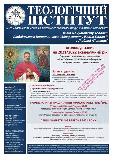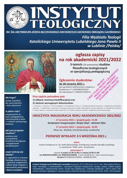 Instytut Teologiczny im. Św. Arcybiskupa Józefa Bilczewskiego Archidiecezji Lwowskiej ogłasza zapisy na rok akademicki 2021/2022