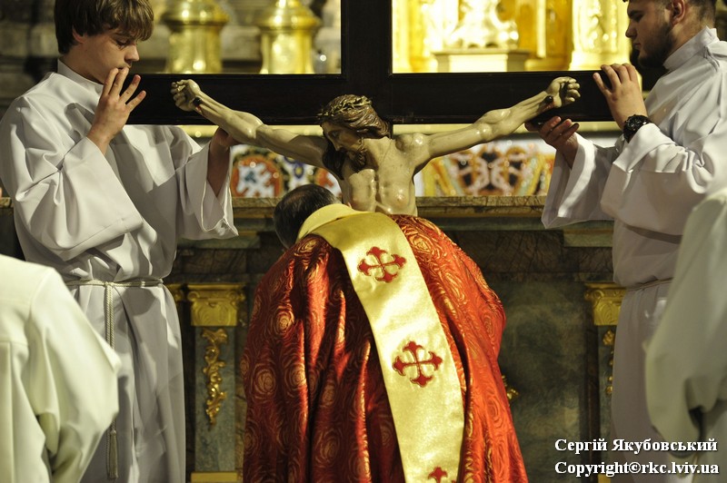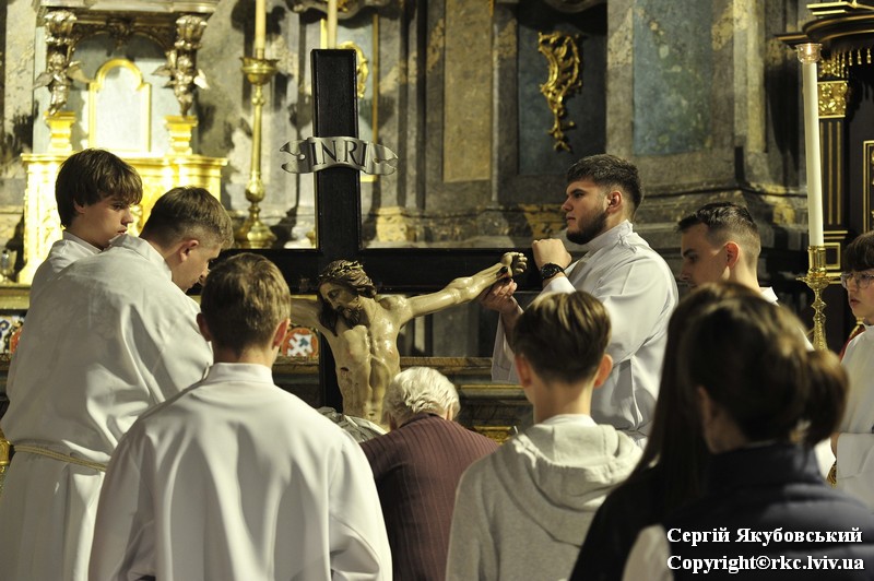 Wszyscy obecni modlili się wspólnie szczególnie o zakończenie wojny i pokoju w Ukrainie. Wielki Piątek to jedyny dzień w roku liturgicznym, w którym nie odprawia się Mszy św., natomiast odbywa się nabożeństwo Męki Pańskiej, podczas którego czytana jest Ewangelia św. Jana o męce i śmierci Jezusa Chrystusa oraz adoracja krzyża, na którym ukrzyżowano Chrystusa.