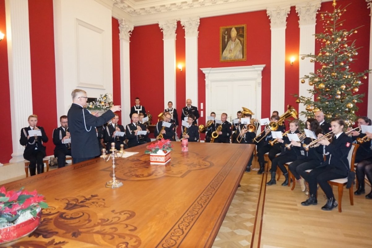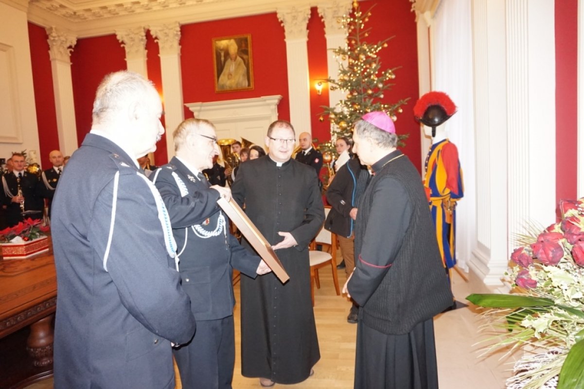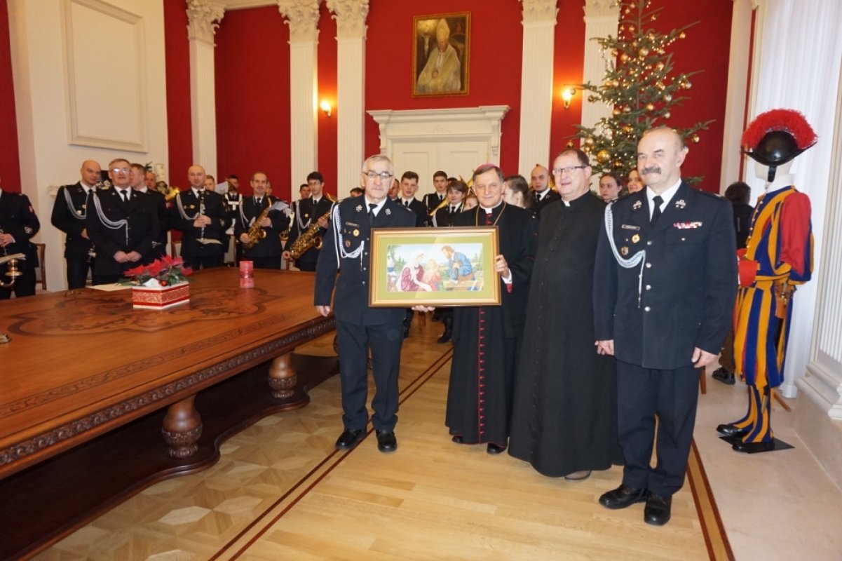 Podarowali arcybiskupowi obraz Świętej Rodziny. Przypominamy że ta orkistra grała u nas we Lwowie w ubiegłym roku pod czas procesji Bożego Ciała, a w niedzielę 10 stycznia b.r. mają koncertować w katedrze lwowskiej.