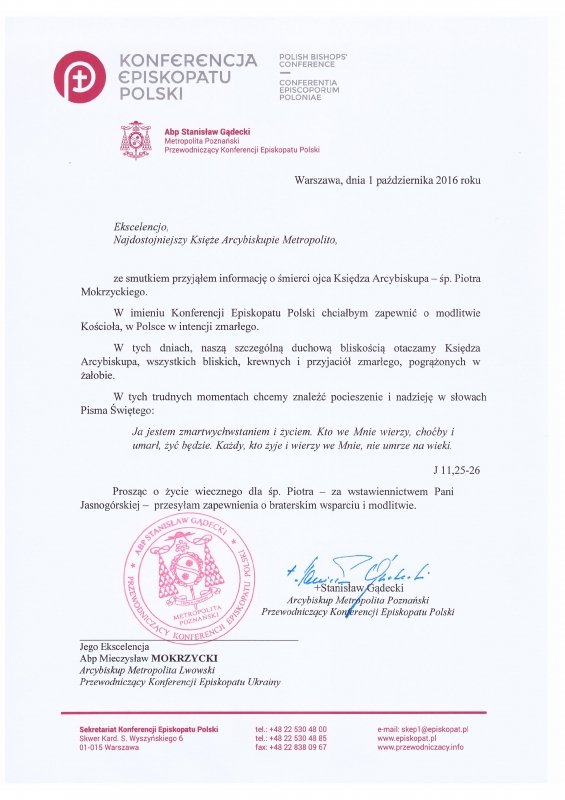 W tych dniach, naszą szczególną, duchową bliskością otaczamy Księdza Arcybiskupa, wszystkich bliskich, krewnych i przyjaciół zmarłego, pogrążonych w żałobie.