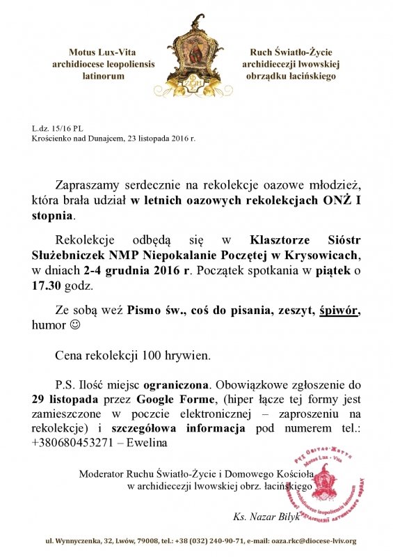 Rekolekcje odbędą się w parafii w Klasztorze Sióstr Służebniczek NMP Niepokalanie Poczętej w Krysowicach, w dniach 2-4 grudnia. Początek spotkania w piątek o 17.30 godz.