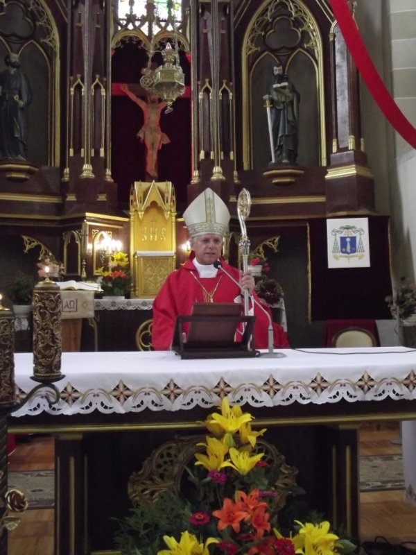 Przed mszą św. przedstawiciele rodziców poprosili Ks. Arcybiskupa o udzielenie sakramentu dojrzałości chrześcijańskiej swoim dzieciom. Słowa powitania skierował również ks. proboszcz. Przed błogosławieństwem młodzież podziękowała za udzielony sakrament i poprosiła o poświęcenie krzyży, które potem zostały nałożone im przez Ks. Arcybiskupa. Po Mszy św. wspólne zdjęcie. Przed kościołem, przy grocie Matki Bożej ks. Arcybiskup wraz z księżmi pomodlił się za pomordowanych parafian (25 czerwca 1941 r.)