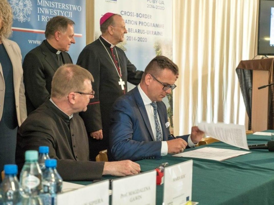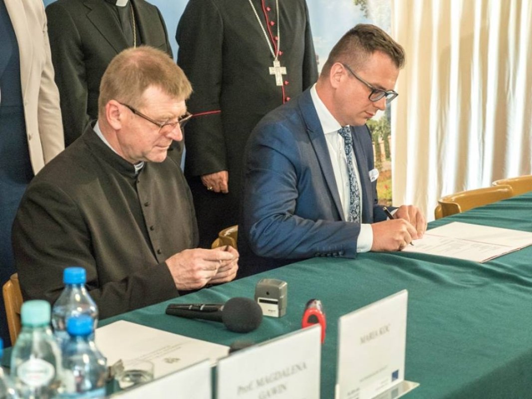 Umowę podpisali: ks. Romuald Kosk proboszcz parafii św. Piotra z Alkantary i św. Antoniego z Padwy oraz Adam Hamryszczak Podsekretarz Stanu w Ministerstwie Inwestycji i Rozwoju.