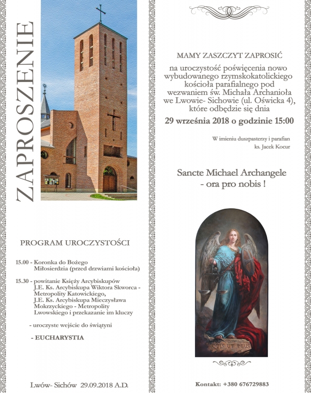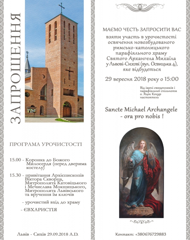 Oświęcenie nowozbudowanego kościoła Michała Archanioła we Lwowie (mkrn Sichów) odbędzie się 29.09.2018. Uroczystości poprowadzą abp Lwowski Mieczysław Mokrzycki i abp Katowicki Wiktor Skworc.
