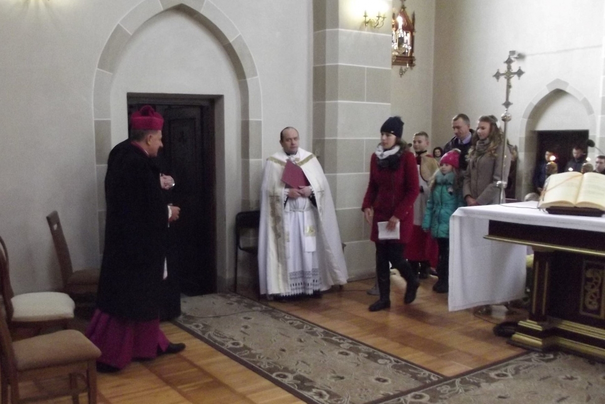 W sobotę, przed uroczystą Mszą świętą inaugurującą wizytację przedstawiciele parafii, państwo Tadeusz i Luba Dobrowolscy, jubilaci z 60-cio letnim stażem małżeńskim, przywitali Arcybiskupa chlebem i solą. A państwo Jan i Elżbieta Gnus wraz z dziećmi wypowiedzieli słowa przywitania. Następnie ksiądz proboszcz Andrzej Draws przedstawił historię parafii i również przywitał Ojca Archidiecezji.