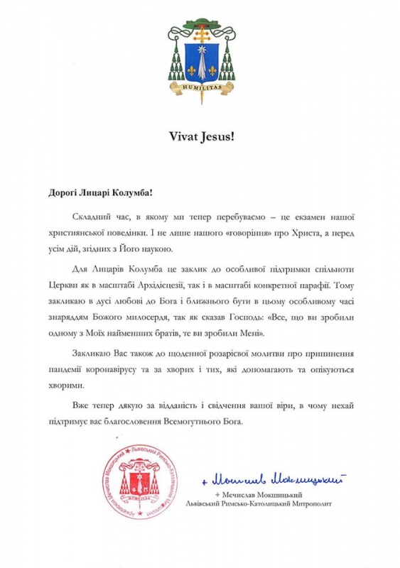 Apel metropolity Mieczysława Mokrzyckiego do Rycerzy Kolumba w sprawie sytuacji z koronawirusem