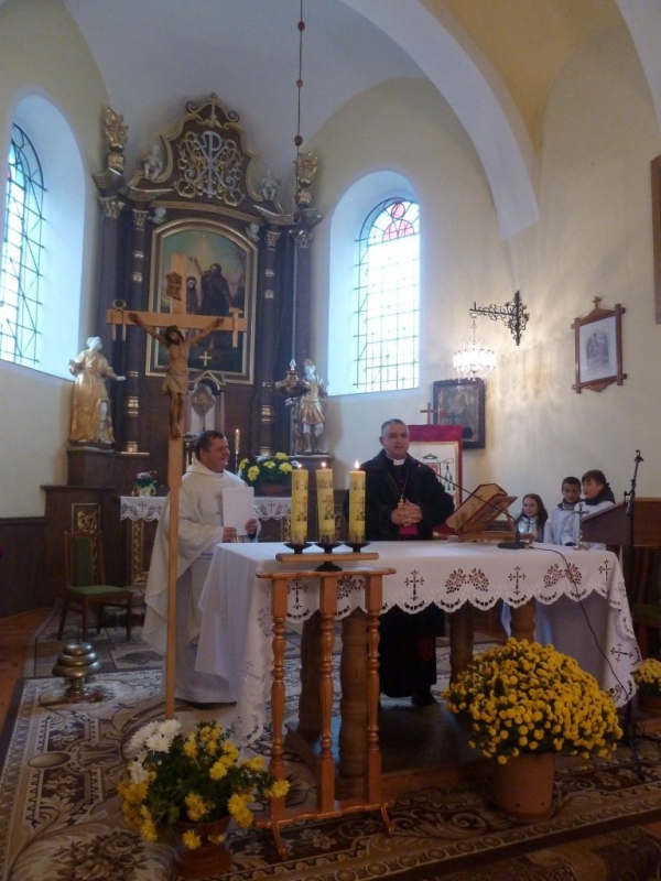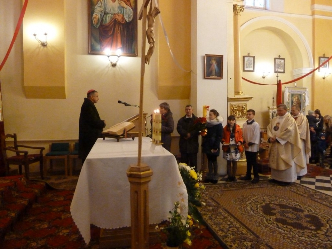 Proboszcz parafii ksiądz kanonik Wiktor Pałczyński wraz z parafianami uroczyście powitali biskupa Leona Małego. Po uroczystym powitaniu, o godz. 1100, została odprawiona Msza Święta. Po Mszy Świętej odbyło się spotkanie z parafianami, w czasie której wierni przedstawili biskupowi swoje problemy oraz podzielili się swoimi osiągnięciami.