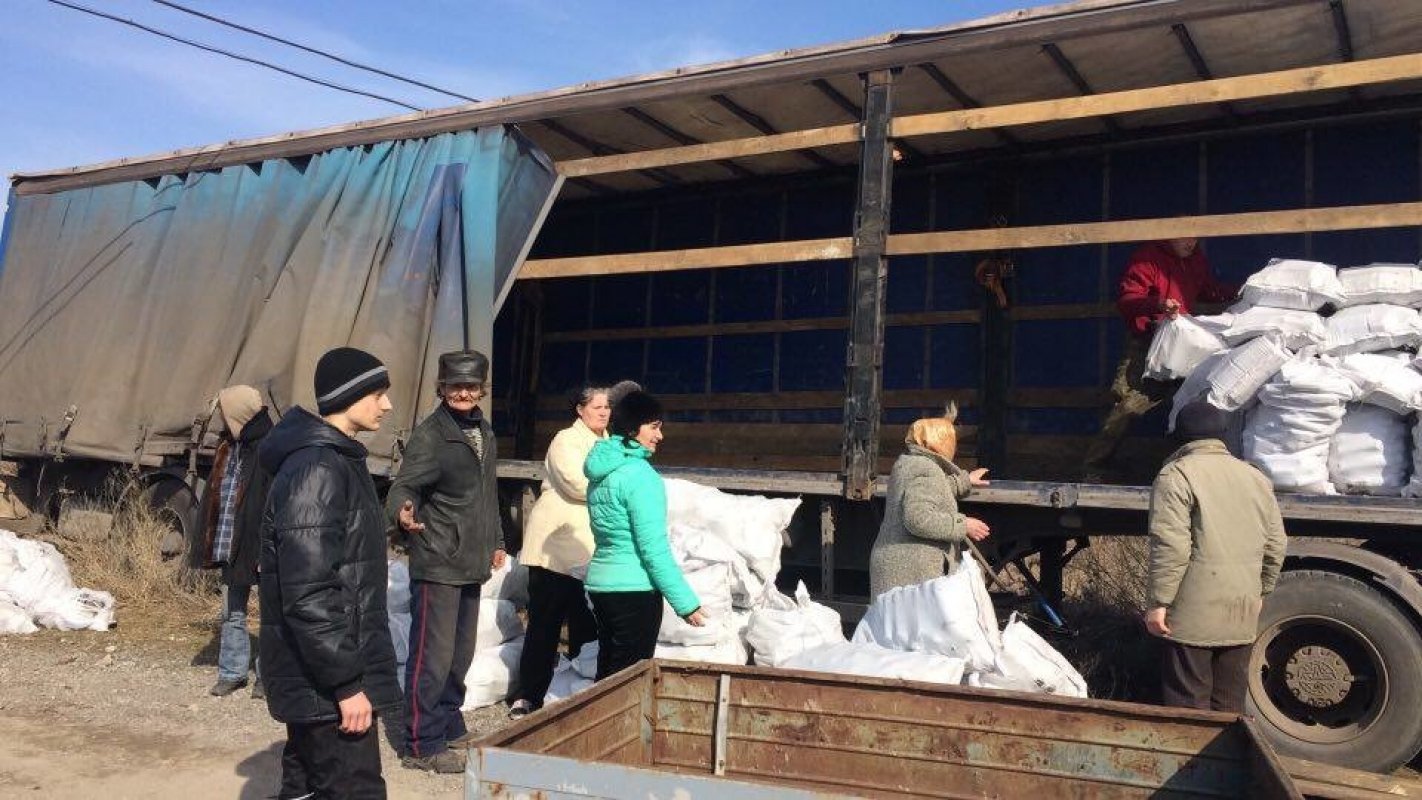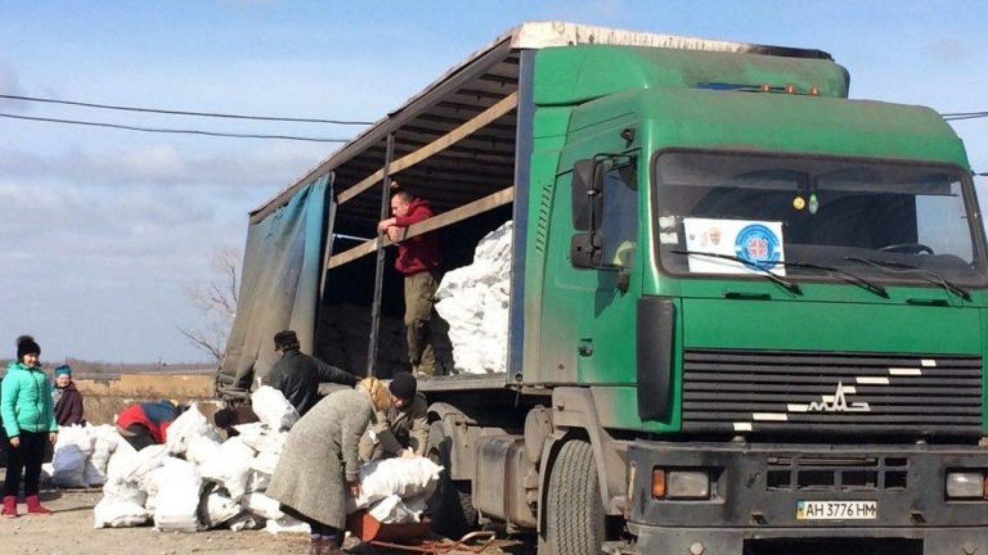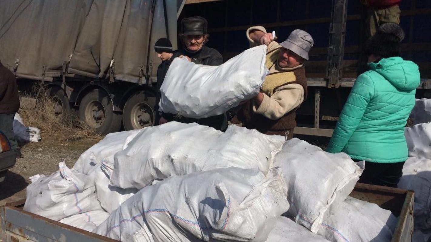 На фото: волонтеры Христианской службы спасения раздают топливные брикеты в Сопино и Лебединском под Мариуполем, 11 марта 2017 года