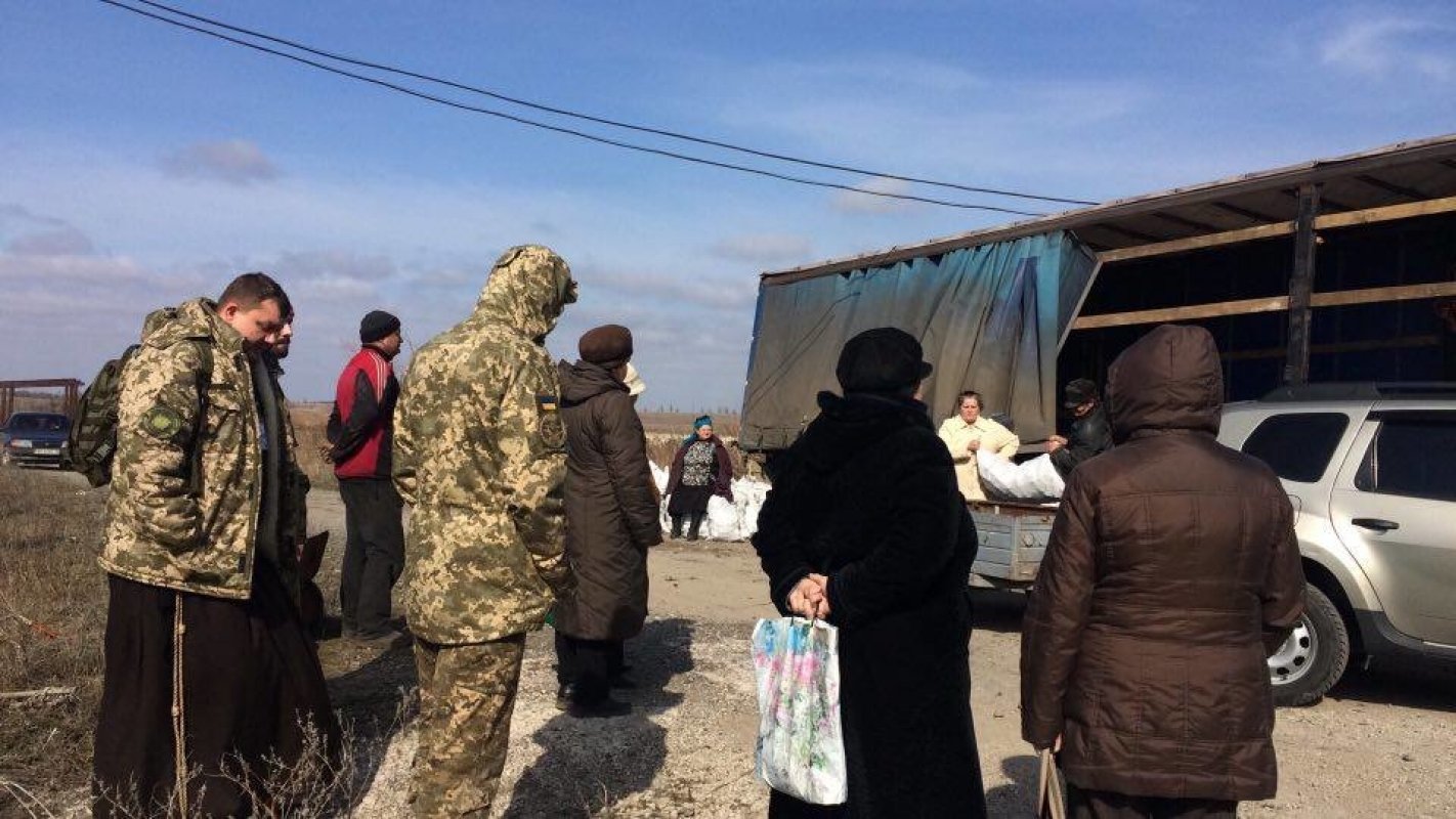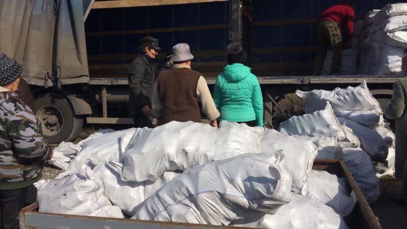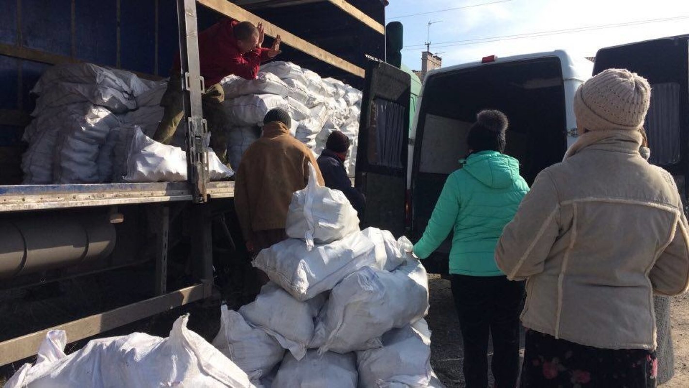 На фото: волонтеры Христианской службы спасения раздают топливные брикеты в Сопино и Лебединском под Мариуполем, 11 марта 2017 года